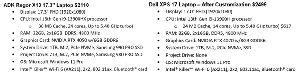 I expected the Dell laptop to be cheaper than the custom-built ADK laptop optimized for audio production because of Dell’s big purchasing power, Intel incentives and the money Dell makes from preinstalling lots of bloatware like antivirus software. In the end, the ADK laptop costs over $400 less when you include taxes.