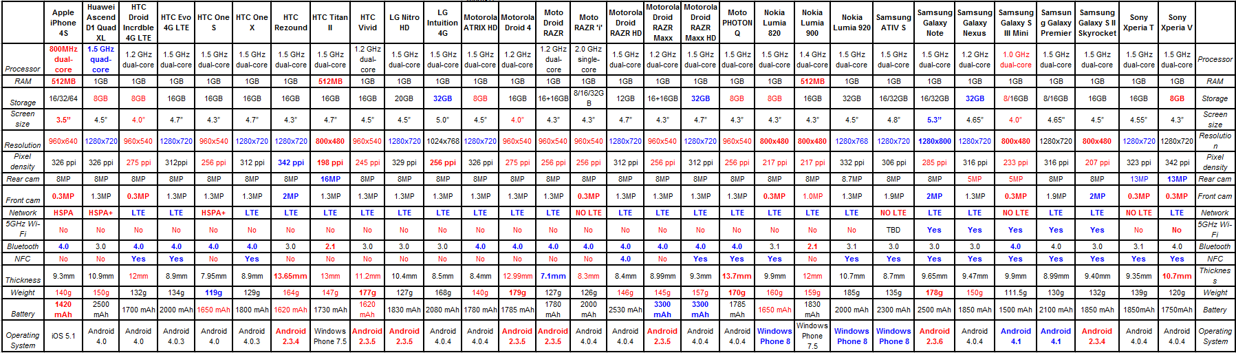 You can see all of the key specs for the top eight finalists below. Items which appear as blue-faced text show the winner in each area. Items which appear in red-faced text indicate an area of weakness compared to the other phones in this chart.